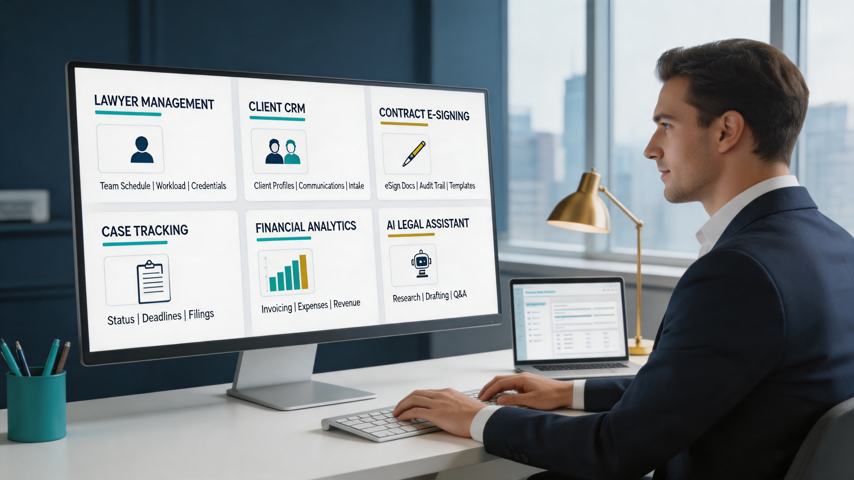 2026年4月26日,泰州法律顾问选型报告指出法律检索从人工转向AI辅助分析,客户响应时效从"天"缩短至"小时";司马阅联合邦盛律师事务所开启法务场景AI深度融合;《AI原生》新书发布会强调"不是外挂,是重构"。本文深度解析律师事务所智能管理系统如何通过十大核心功能模块(律师管理、客户管理、合同管理集成腾讯电子签、案件管理、回款管理、财务管理、统计分析、系统管理、当事人端微信小程序、AI赋能模块)全方位提升律所运营效率。
